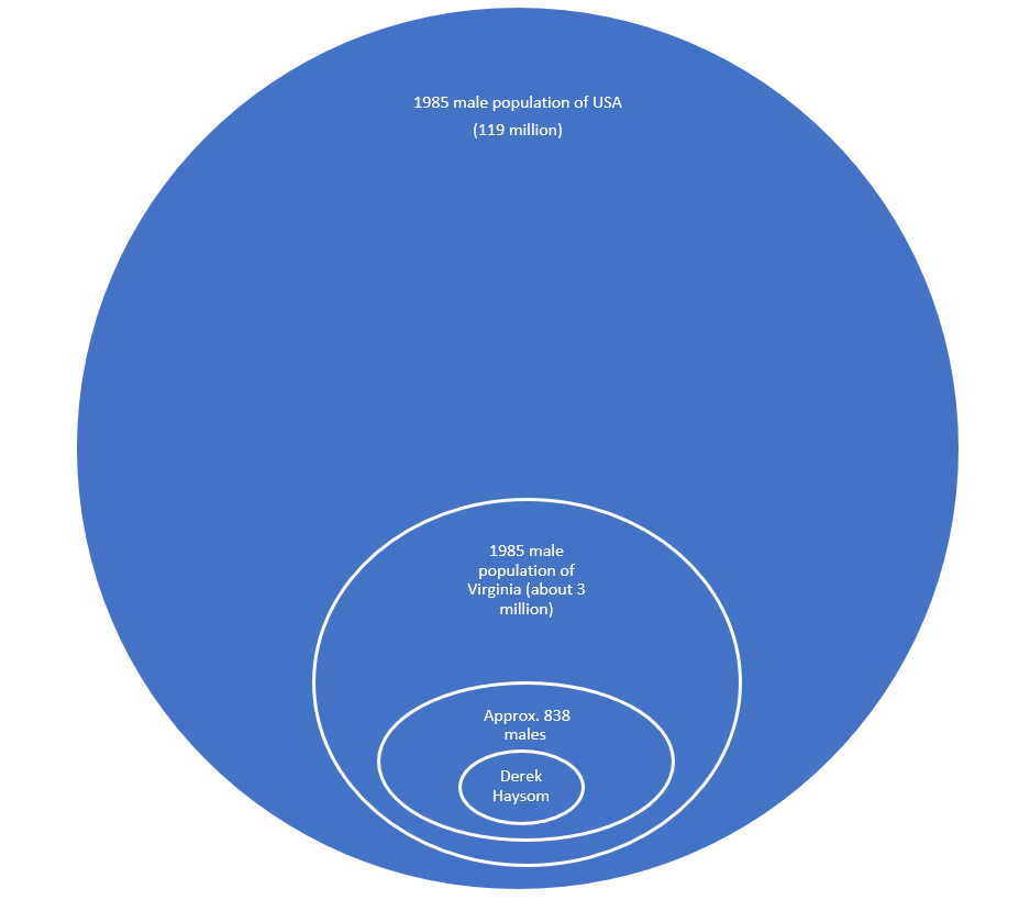 Of course, this is not to scale — the circles for Derek Haysom and the approximately 800 people who shared his exact DNA markers would have to be tiny pinpricks compared to the vast ocean of the male population. Further, under Söring’s theory, there were supposedly two unknown males at the crime scene. Assuming they weren’t identical twins, this meant that, by sheer coincidence, two males who shared the same genetic markers as approx. .00000006% (800/119,000,000) of the male population of the USA happened to converge upon Loose Chippings on 30 March 1985 with murder on their minds.